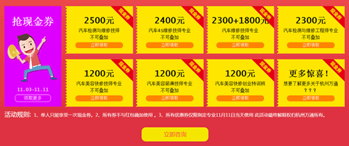驚喜1:報名享優惠,千元現金送不停 這個“雙11”,杭州萬通助學紅包,陪你嗨到底!活動期間進入杭州萬通汽車教育官方網站,即可領取1000到4100元紅包優惠券。搶現金券,要的就是速度!